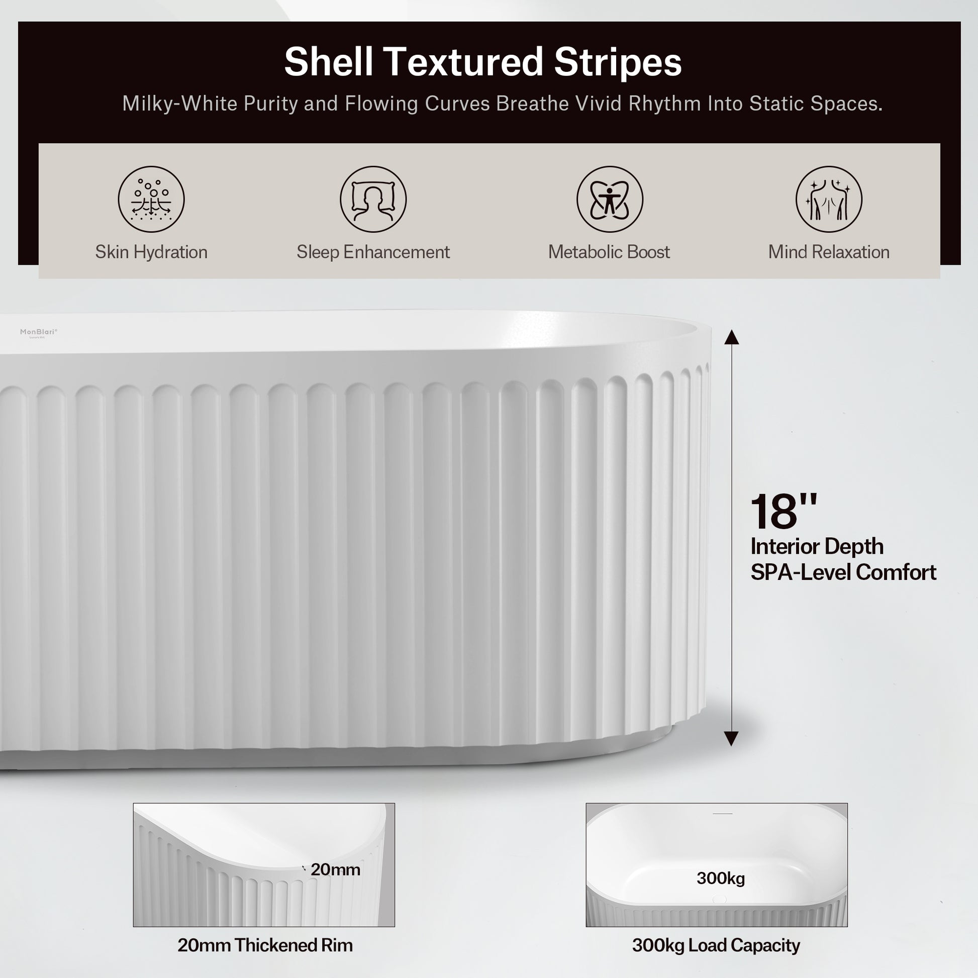 Deep Soak Ergonomics: Designed with a generous 18" interior depth, the VENUS supports full-body immersion for SPA-level comfort. Its ergonomically contoured inner curves provide targeted support for the neck, shoulders, back, and waist.