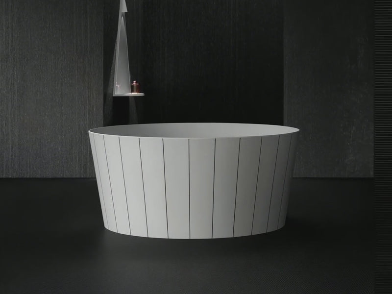 The bathtub’s white artificial stone body delivers a smooth, refined surface with exceptional durability and thermal retention. Each vertical resin inlay is hand-engraved and meticulously embedded, creating delicate linear patterns that evoke a sense of rhythm and sophistication. This fusion of crafted precision and contemporary art transforms the bathtub into more than a functional object — it becomes a statement of aesthetic harmony and material innovation.